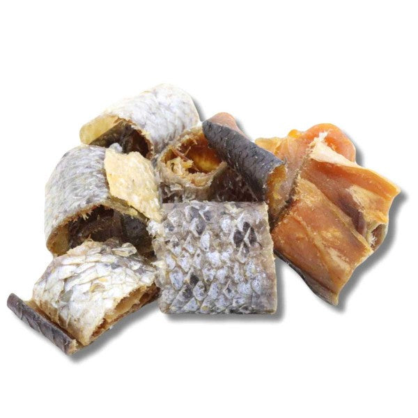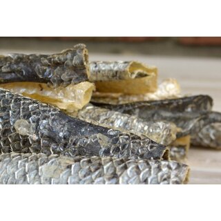 Lachshaut Natur: Ganze Stücke getrockneter Lachshaut – perfekt zum Knabbern und zur Zahnpflege.